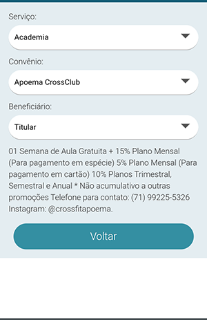 Ao clicar no primeiro ícone " Convênios"será exibido a lista das empresas convêniadas com sua associação ou condominio, e os destalhes e percentual de desconto ofertado, na primeira opção é possível filtrar o estabelecimento por categoria EX: Academia e no segundo campo será exibido as opções.
