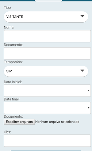 Ao clicar e mcadastrar visitantee será exibido o formulário abaixo, na opção tempórario se marcar SIM, será exibido os campos com a data incial e final, e a entrada só será liberada nos dias que você preencher, se marcar temporário Não ficará sempre livre a entrada do visitante cadastrado.
