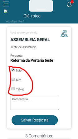 Na página abaixo basta escolher a sua resposta, também existe a possíbilidade de fazer algum comentário caso o administrador libere, caso não basta votar e clicar em Salvar Resposta