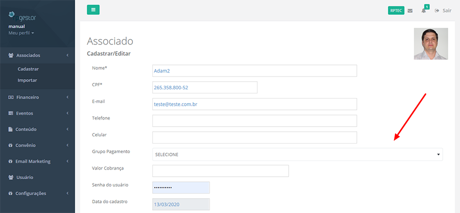 Ao clicar em "cadastrar novo", aparecerá o formuário para cadastro de Associados.