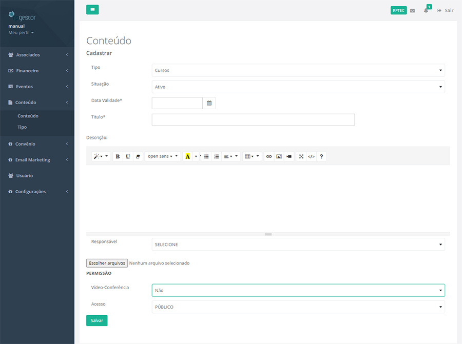 Acesso: Se escolher a opção público todos os associados ativos poderam visualizar, se deixar restrito só quem tiver selecionado no campos "pessoas" que aparece assim que marcar a opção restiro e os administradores da plataforma poderam ter acesso ao conteúdo, essa opção é ideal para conteúdos que serão disponibilizados para o público interno da sua associação, conselhos, funcionários, reuniões internas etc...